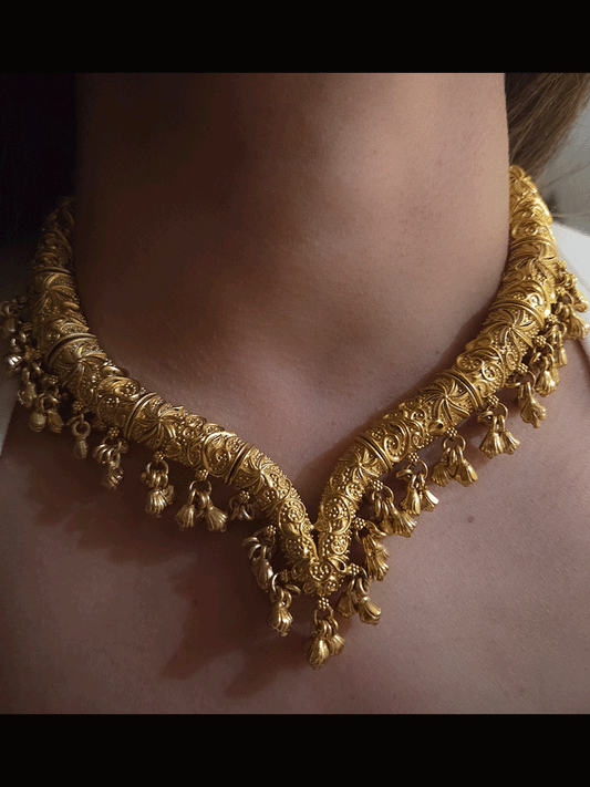 Gold finish self design hasli neckpiece with ghunghru hangings