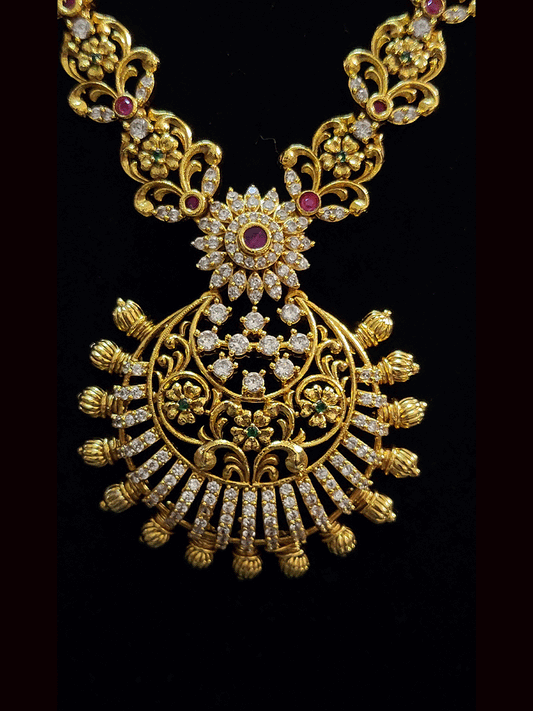 5 inch string round pendant with flower design AD,green and ruby stones studded set
