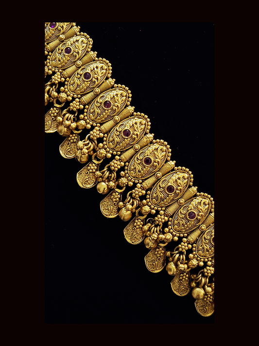 4cm broad oval ruby stones studded tukdies waistbelt with leaf tukdi hangings