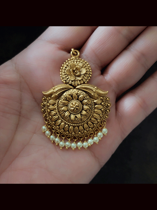 Half flower leaf design detailing maangtika with white bead hanging