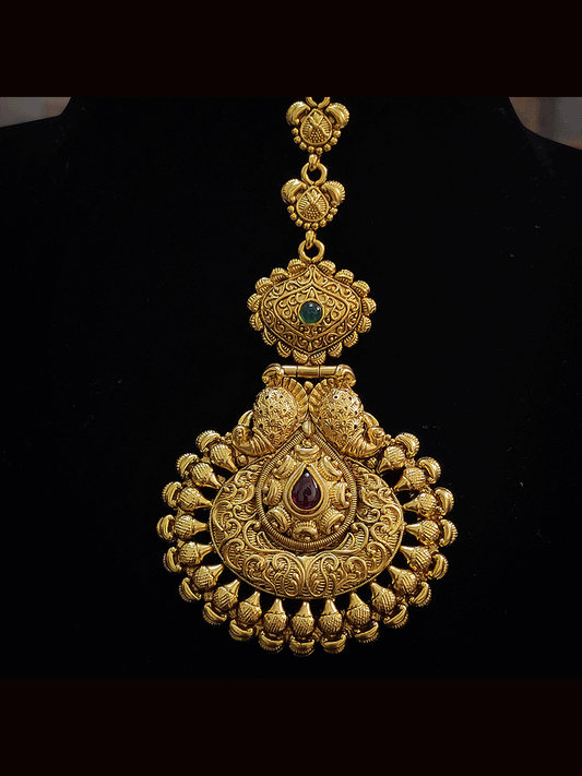 Peacock top half flower tear drop ruby stone leaf chain mathapatti