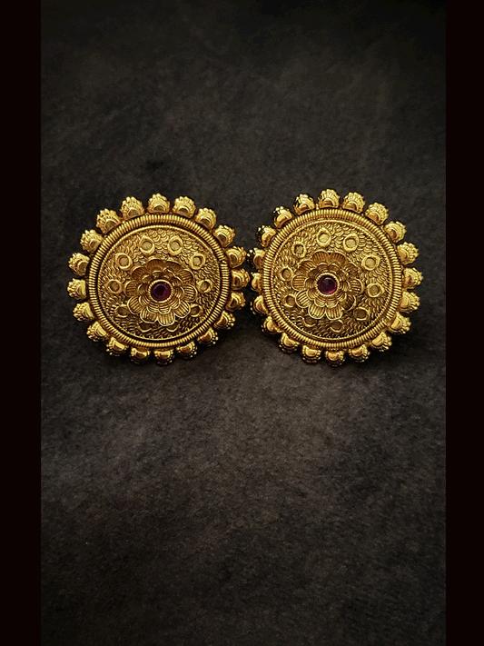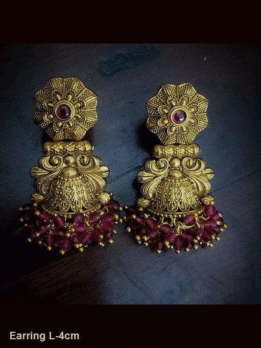 Flower top with ruby stone 4cm long half jhoomki earrings with beaded frill