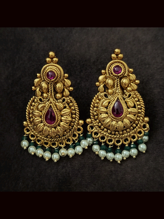 Tear drop ruby stone traditional design earring with green and white bead drops