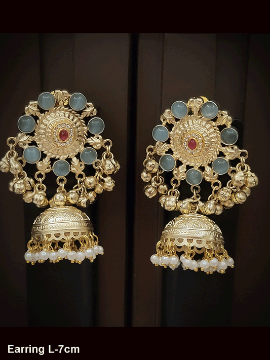 Circular dual finish 4cm ghunghru hanging earrings with kundan in coloured stones center
