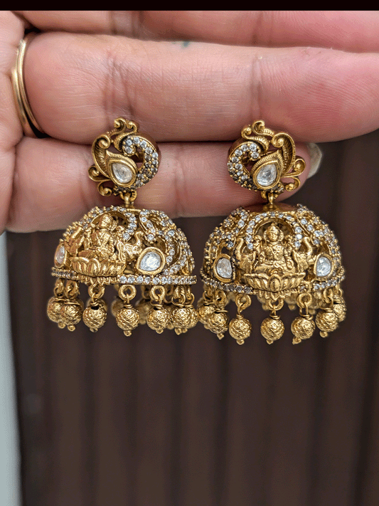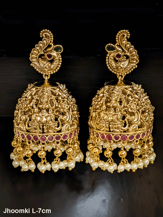 Ruby and green stones studded 7cm long laxmiji domb jhoomki with peacock top design