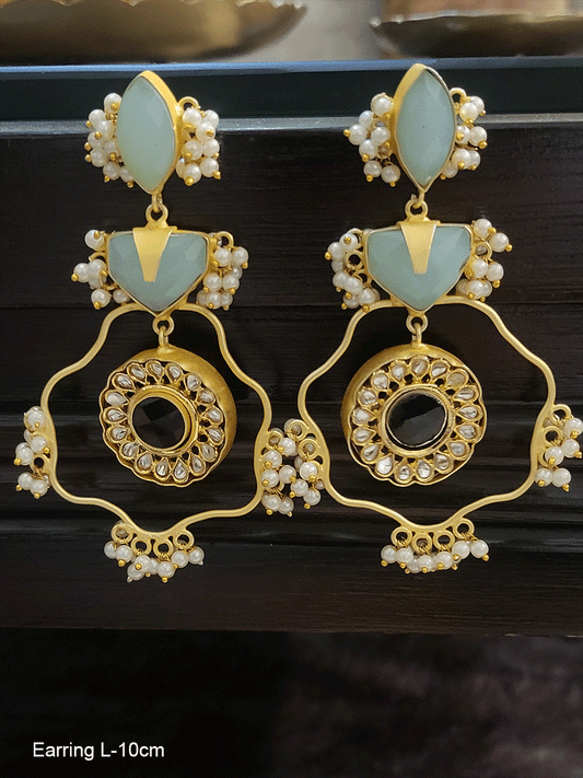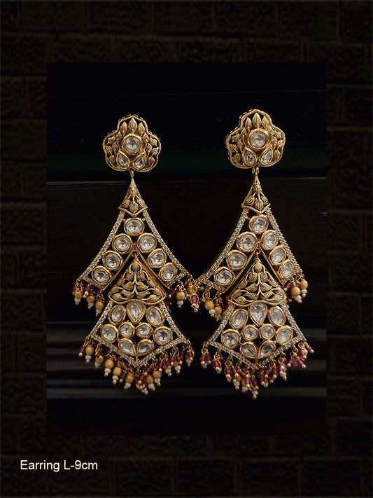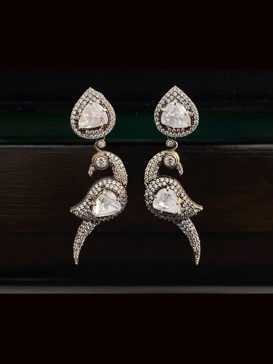 Antique finish AD and kundan peacock design rectangular stones long earrings with pearl drops
