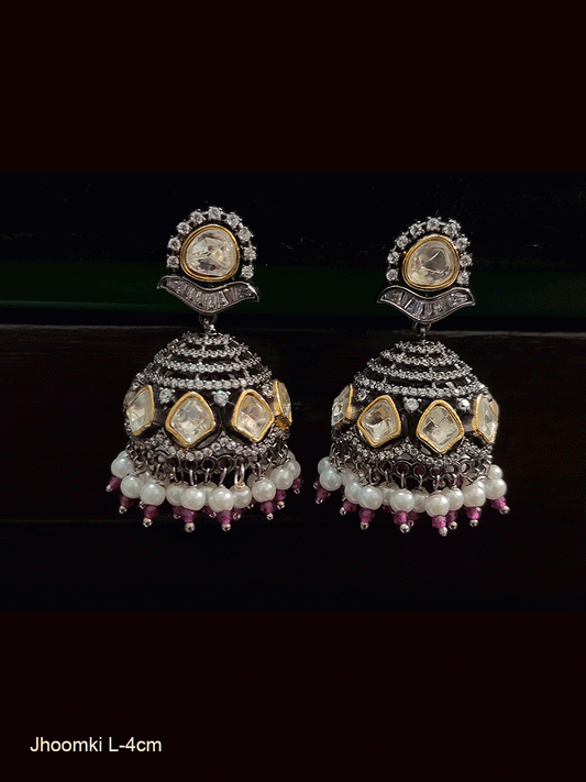 Uncut polki antique finish jhoomkies with white and coloured beads detailing