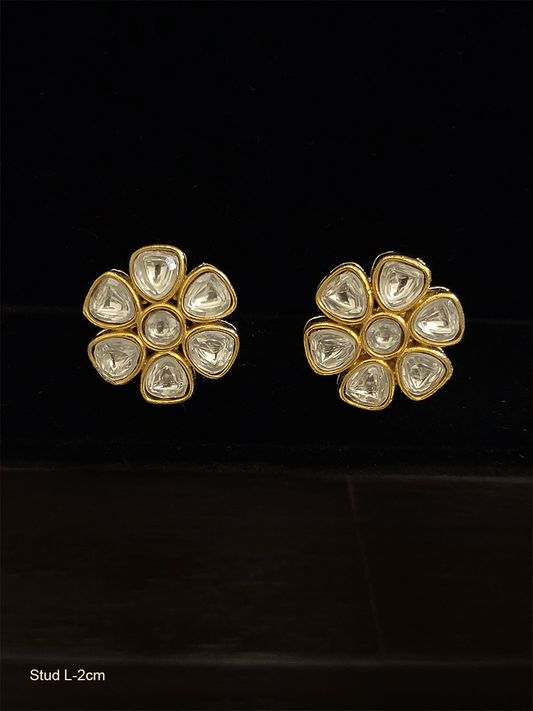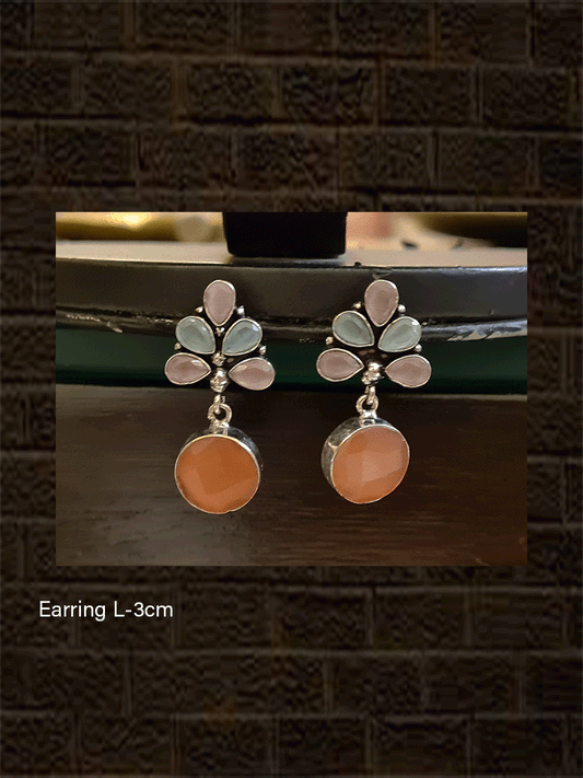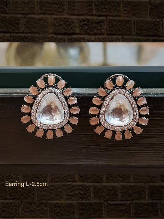 Pearly lace on one edge of stone studded three leaf german silver earrings
