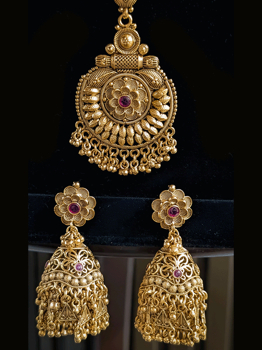 Oval center pendant with ruby stone on flower design side cheed string set