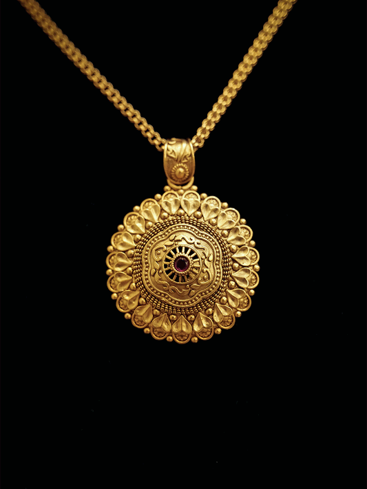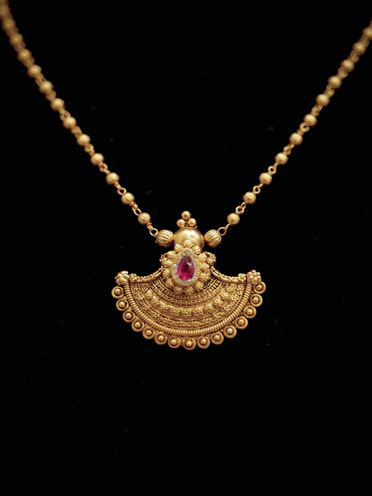 Traditional design tear drop ruby stone pendant set in gold bead chain