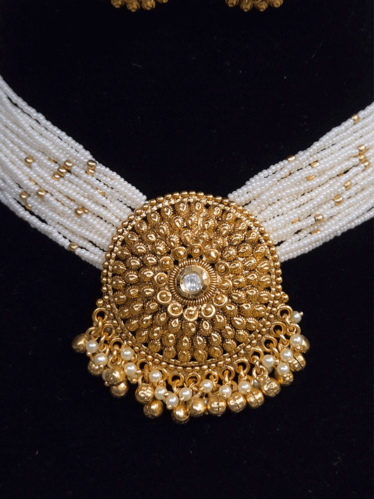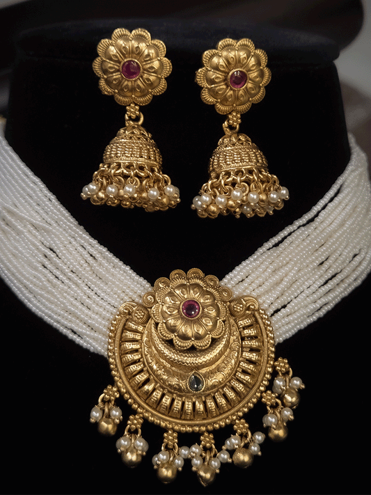Circular flower and self design pendant in cheed and matar bead string(8 inch) set
