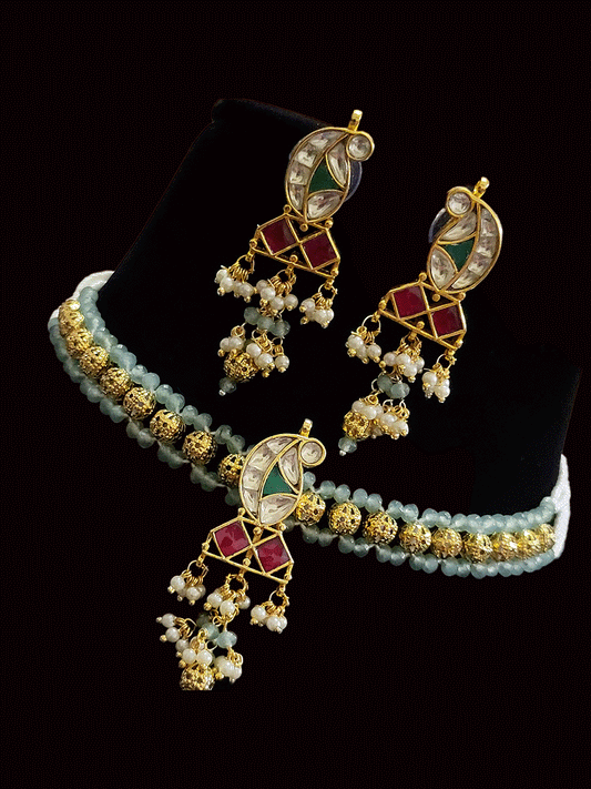 Aqua green and gold bead side string paisley design pacchi kundan center tukdi set