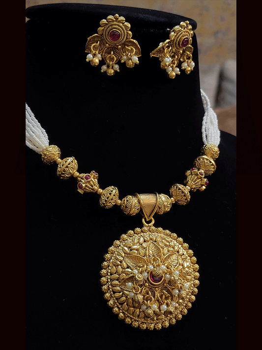 Circular pendant with leaf design and pearly hangings in cheed strings set
