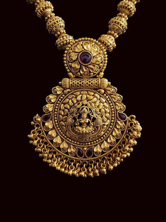 Circular top with ruby stone laxmiji pendant in matar bead string set