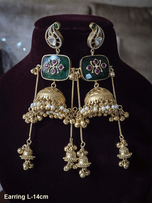 Paisley top design with kundan tukdi center mesh design 13cm long set with green drops