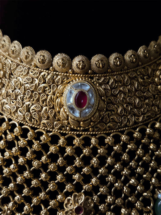 13 cm broad rajputi choker set with chandbali design three hanging paachi kundan tukdies