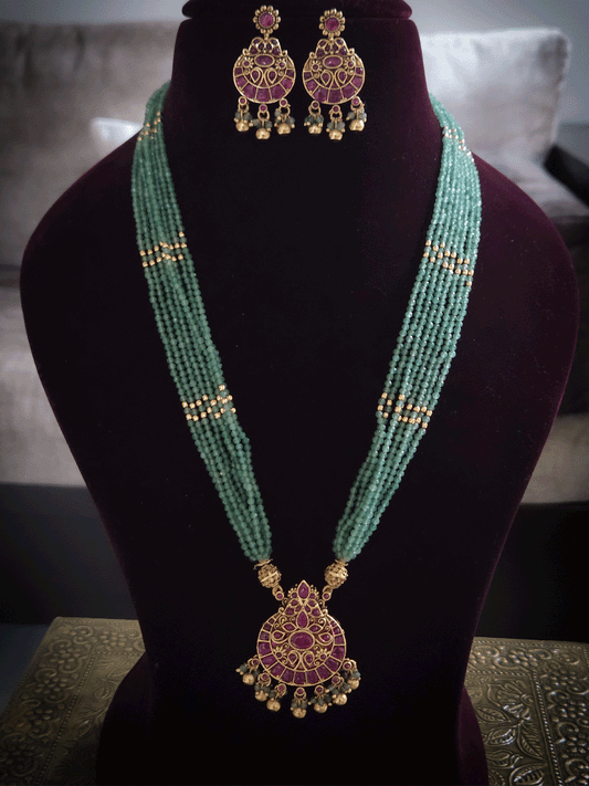 9 inch long Matar bead string in flower center design ruby stone pendant set