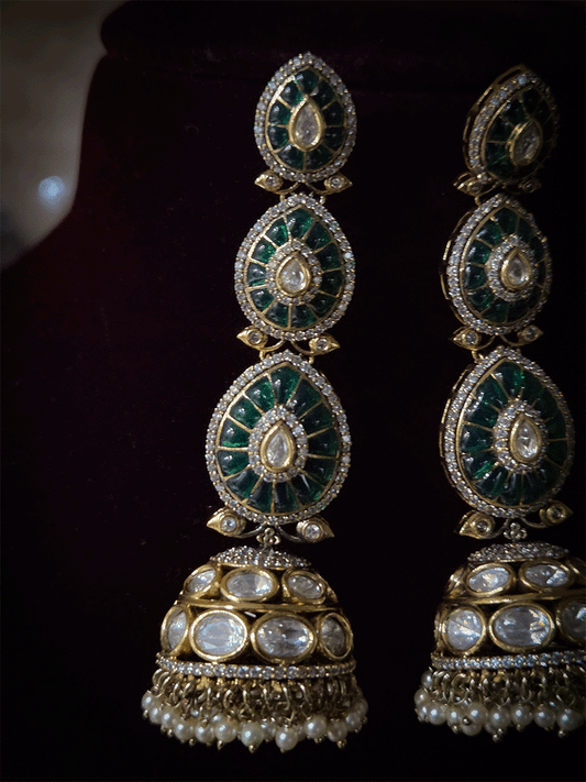 Kundan domb pearl hangings three green leaf top 8cm long jhoomkies