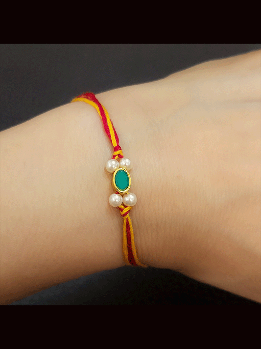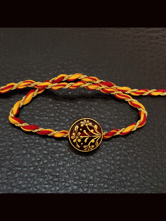 Round maroon and green stone(1.75cm) gold work mauli thread rakhi