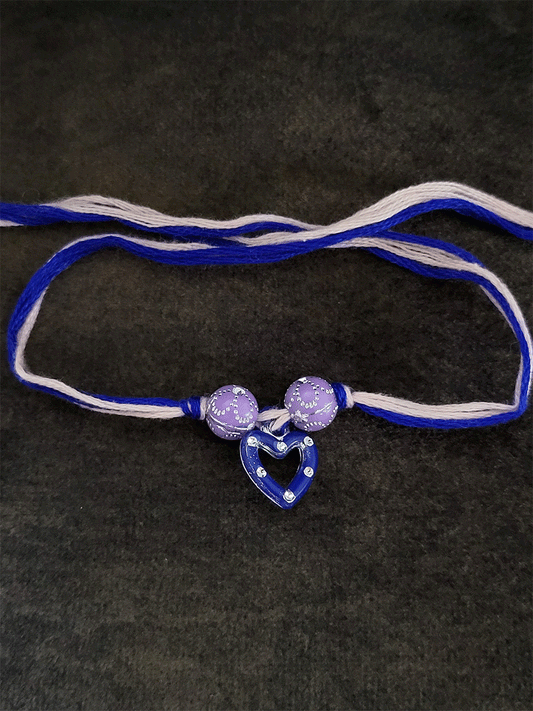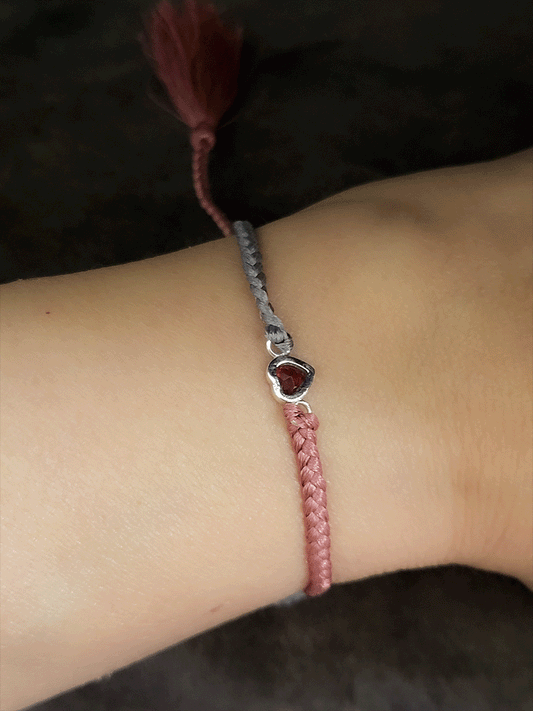 Grey and carrot coloured pull on thread heart shaped red garnet rakhi