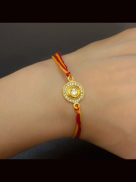 Round(1.5cm) coloured Kundan work with coloured thread rakhi
