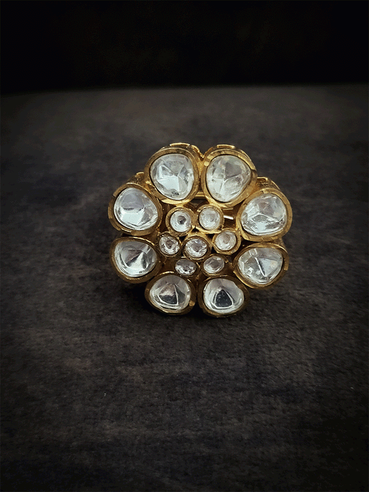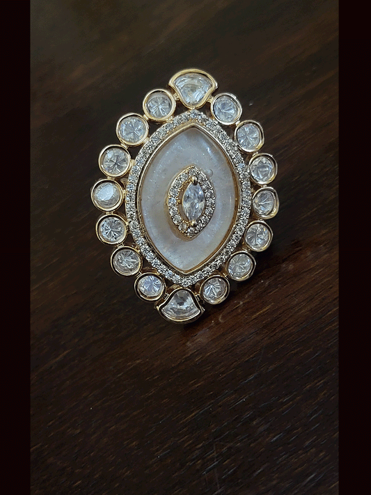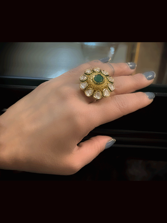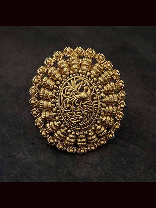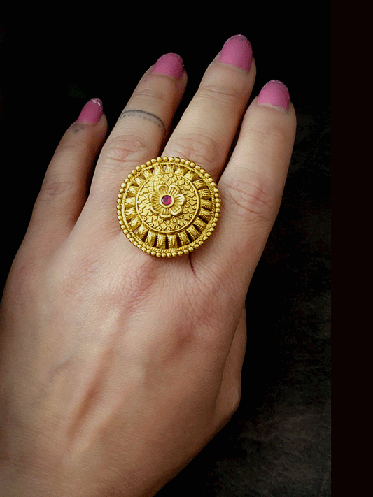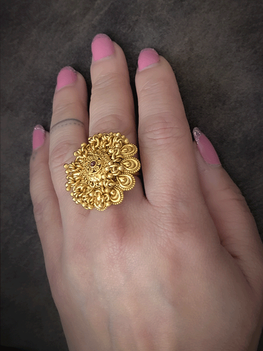 Round adjustable ring with gold bead lace and leaf design around the stone