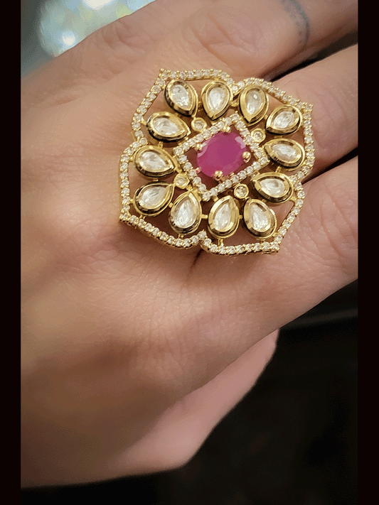 Ruby,green stones flower center round adjustable ring with leaf design edge