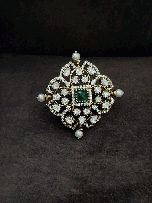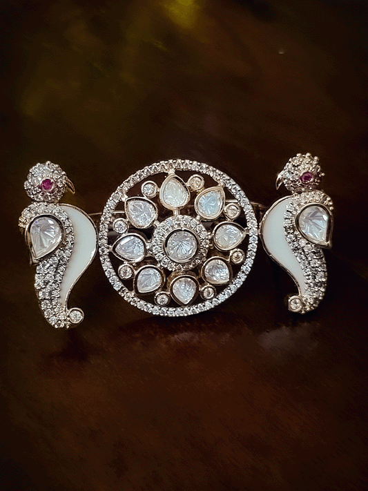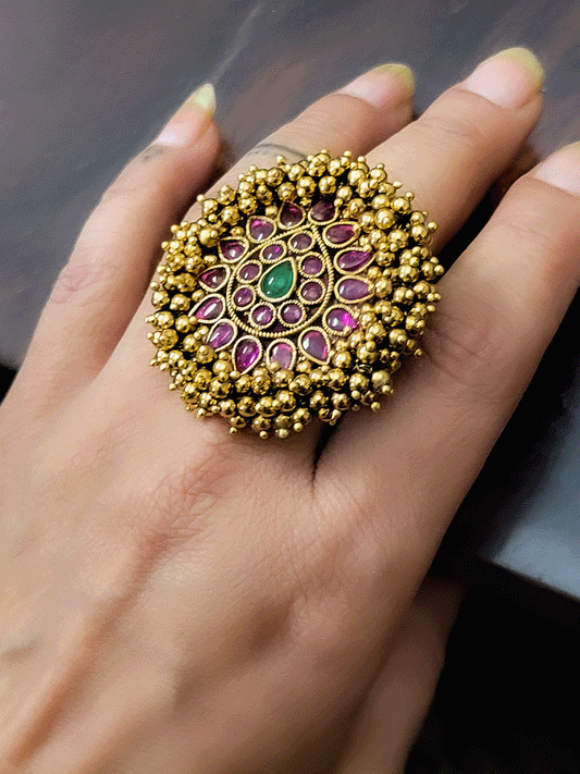 Leaf shaped 5cm long adjustable ghunghru lace ring with ruby and green stones