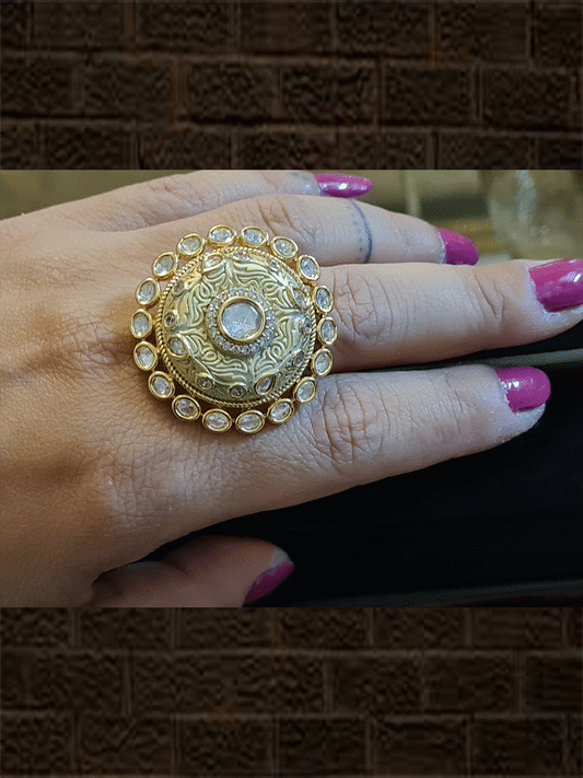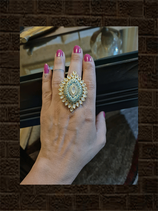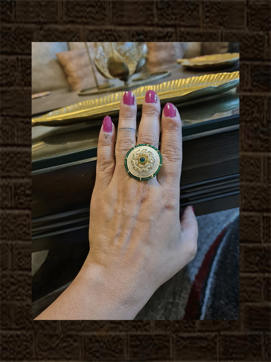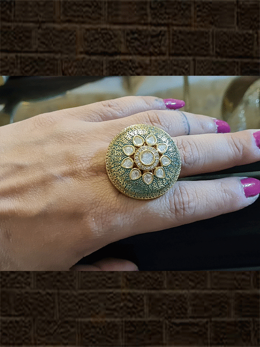 Leaf shaped adjustable kundan ring with AD and enamel work