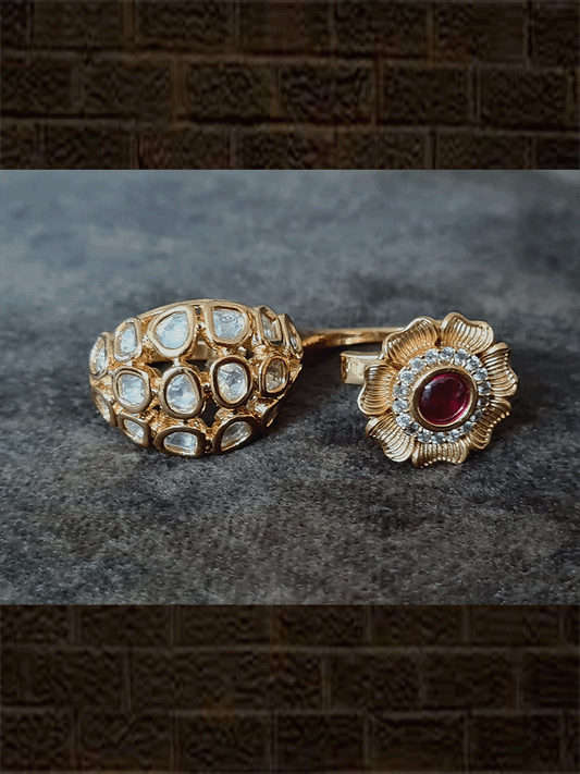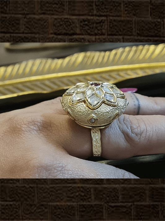 Ivory enamel bold kundan embedded openable crown shaped ring with ruby stone in center