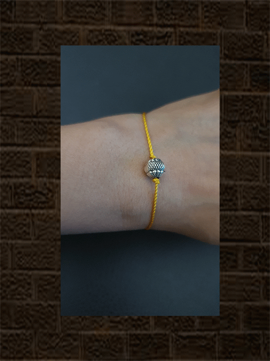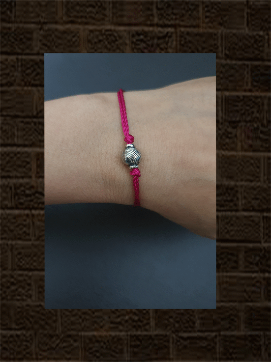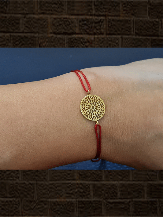 Red pullon dori sterling silver circular gold plated rakhi with two gold beads