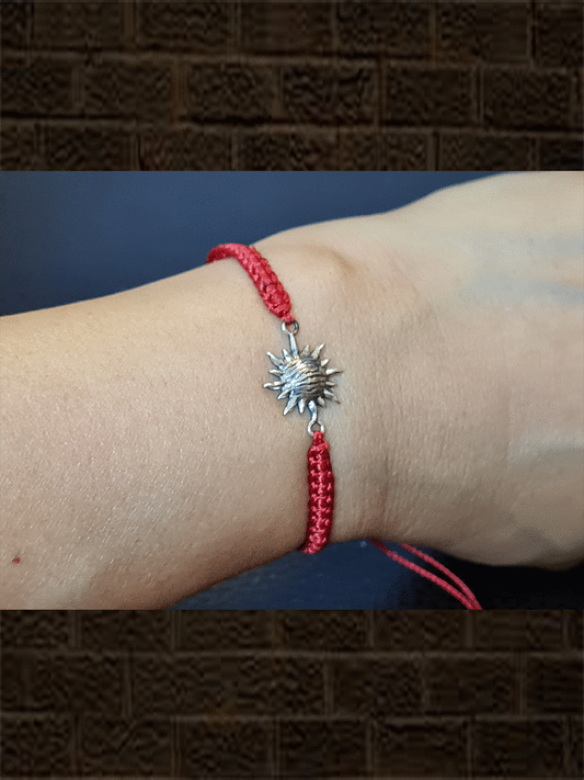 Maroon pull on thread oxidised sterling silver sun design rakhi