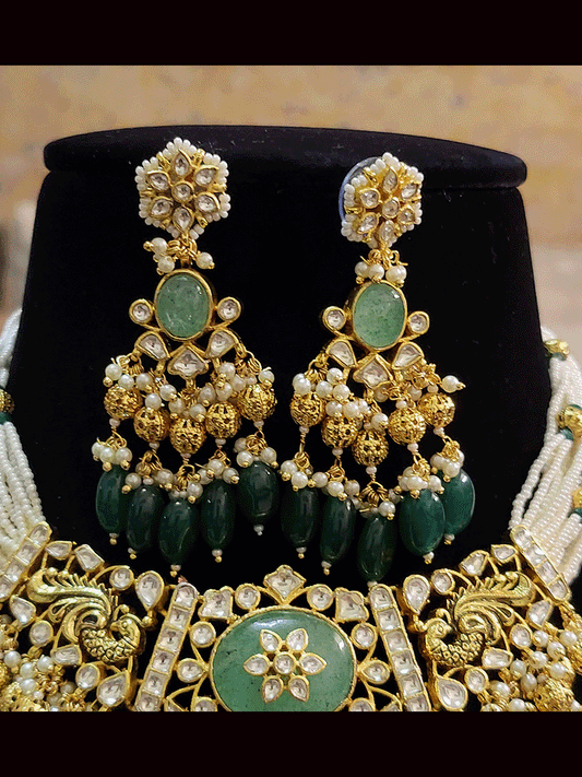 6cm broad kundan and polki studded laxmiji set with peacock design on both sides and jade bead drops