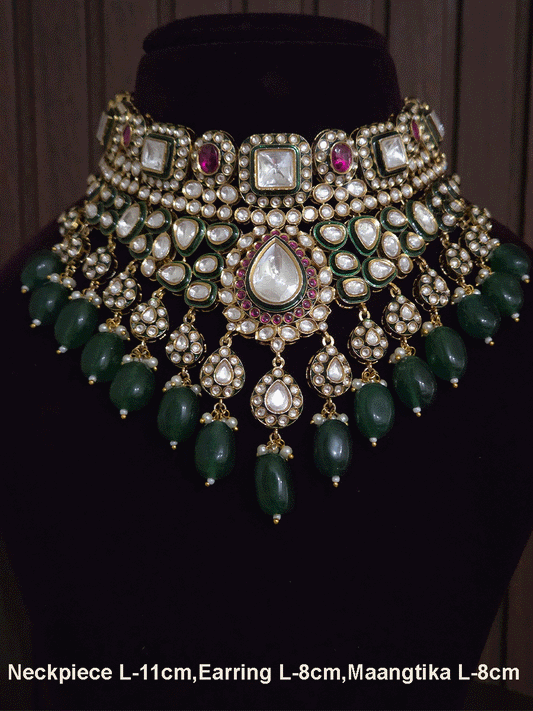 Tear drop and square shaped uncut polki 11cm broad set with green drops and ruby stones detailing