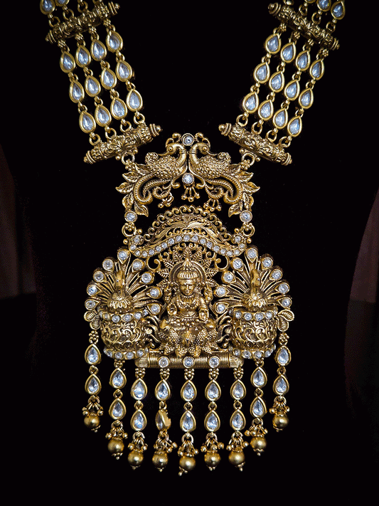 Kundan studded laxmiji with peacock on sides long pendant set with 2cm broad kundan string