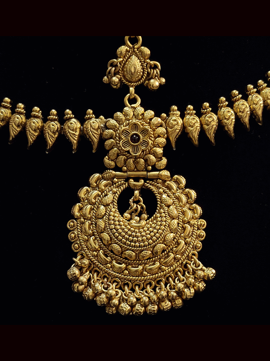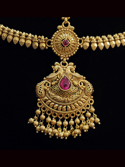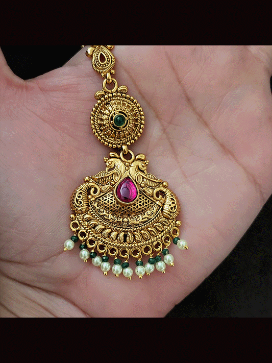 Peacock top half flower tear drop ruby stone leaf chain mathapatti