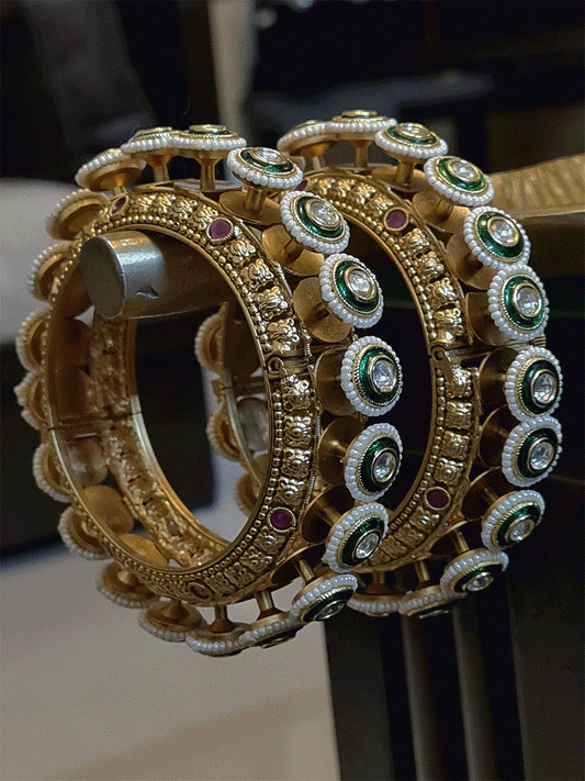 Set of two openable kadas with peacocks and also kundan with green stone flower tukdies with pearly hangings