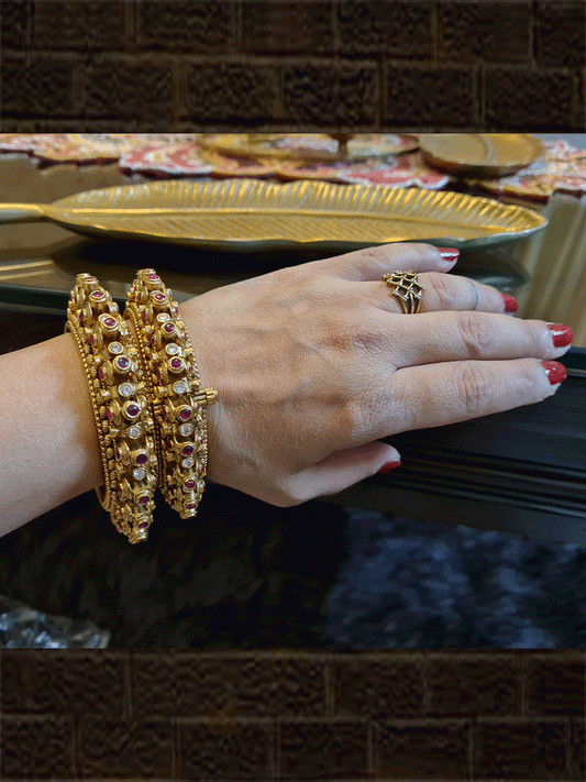 Peacock design broad pacheli type matt gold polki and ruby stone kada's size-2.10