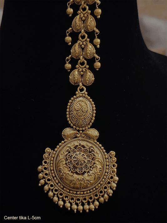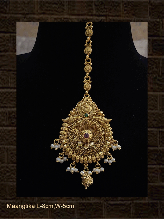 Circular maangtika with center ruby stone bold flower design and leaf design chain
