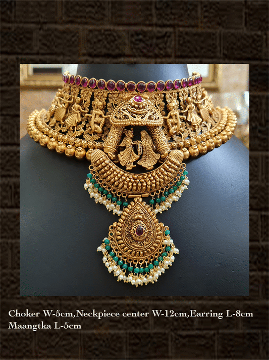 Broad ruby stone embedded krishnaji motif intricate carving set with peacocks and nrityangna's