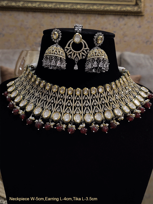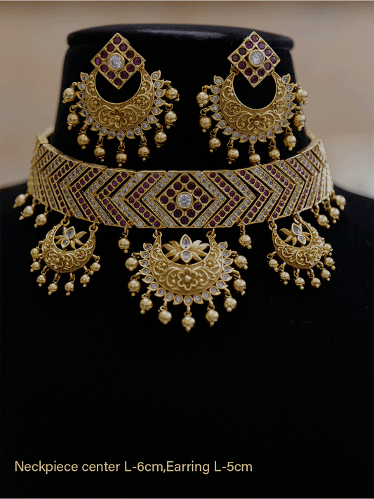 Varmala design broad choker set with long leaf design pendant in the middle with green bead and pearl bead detailing