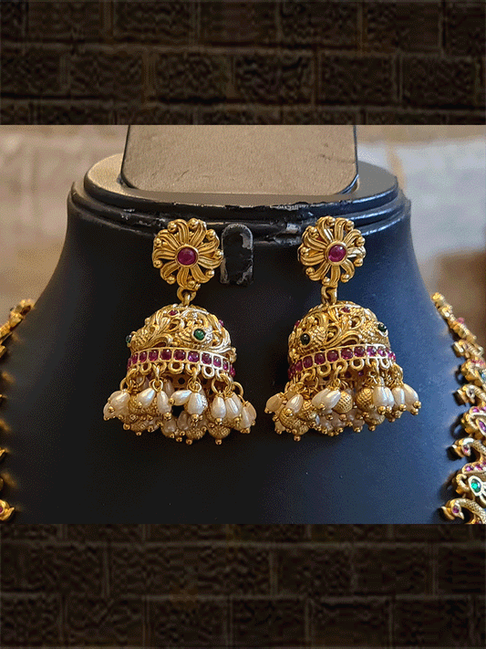 Traditional peacock design long pendant set with ruby and green stones and classy side string
