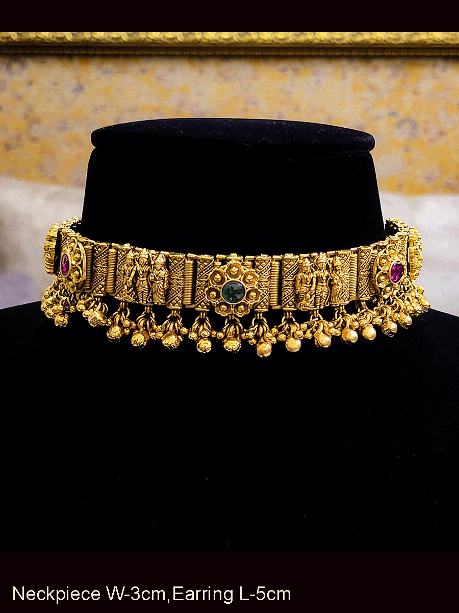 Indulge in the luxurious elegance of our Alternate flower and Ram durbar design chik set, adorned with delicate ghunghru hangings. Each piece features intricate detailing and a unique blend of traditional and modern motifs. Elevate your fashion game with this statement jewelry set.