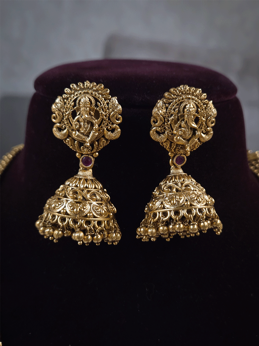 Elevate your devotional accessories with this exquisite five-piece brooch set, each piece featuring intricately crafted gold bead strings paired with a serene seated Ganpatiji motif. Meticulously designed for those who appreciate fine religious jewelry, these brooches combine traditional artistry with refined craftsmanship. Perfect for adorning sarees, dupattas, or traditional attire, each brooch showcases detailed beadwork and spiritual significance. Ideal for daily wear or special occasions, this collection celebrates the divine with elegance and authenticity.