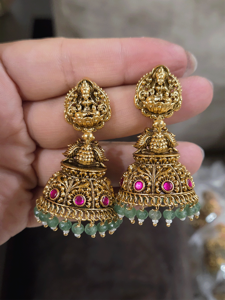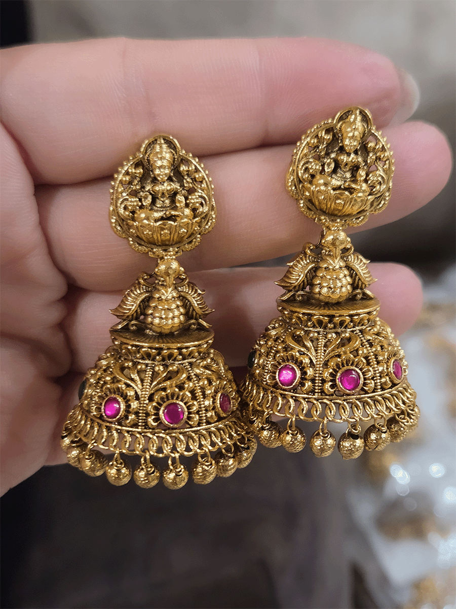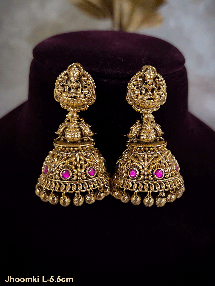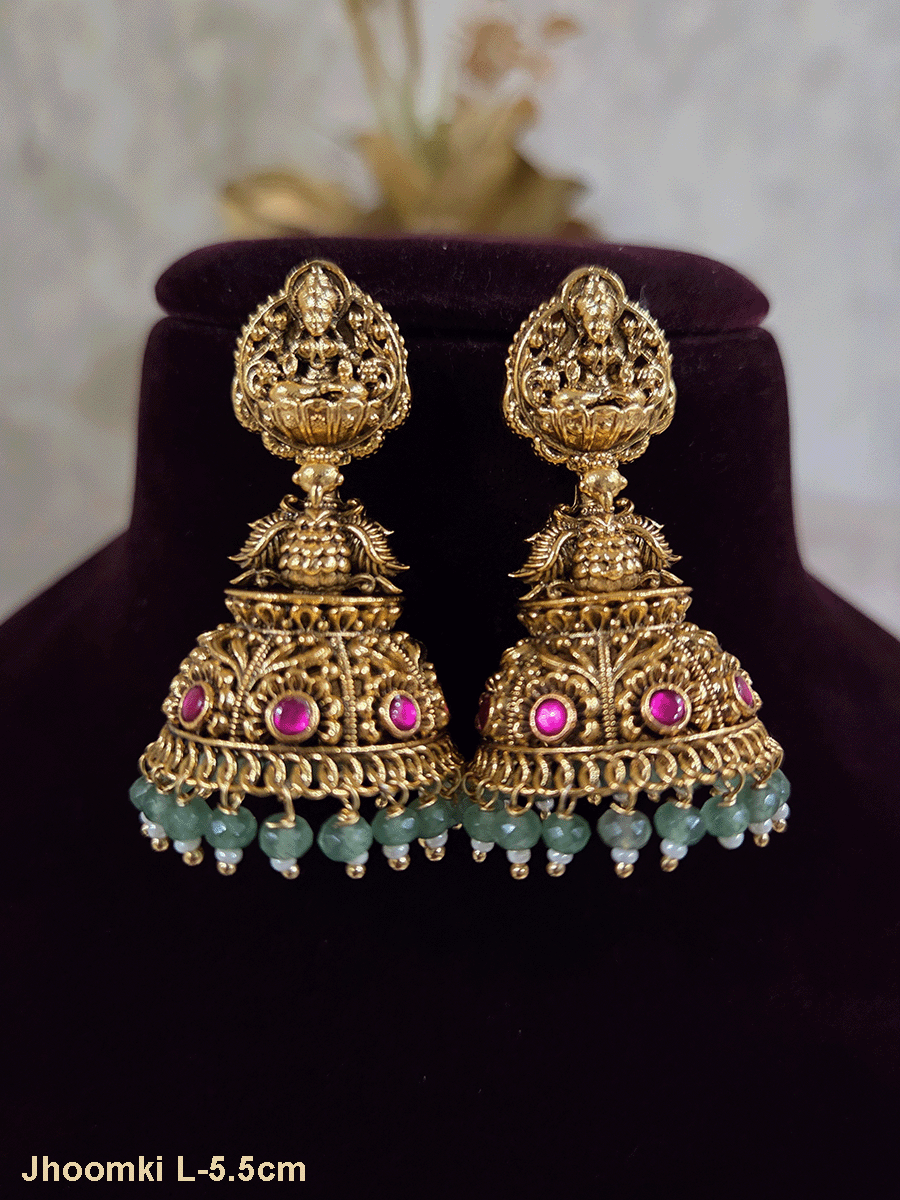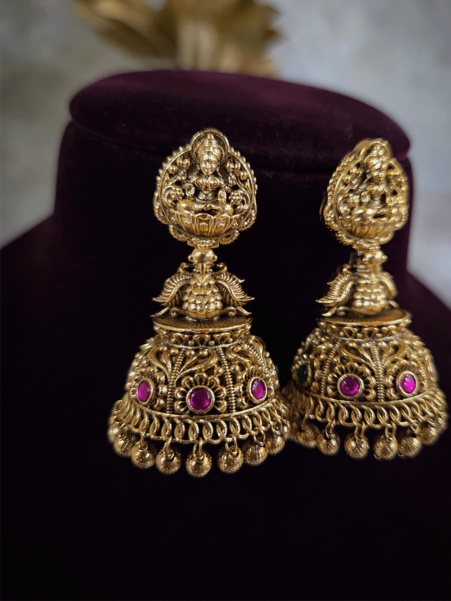 Elevate your ethnic collection with this exquisite domb jhoomki featuring a sacred Laxmiji motif adorned with an elegant peacock nestled among delicate flower designs. Crafted with traditional artistry, this statement piece combines spiritual symbolism with timeless beauty. The intricate detailing and graceful peacock imagery make it a perfect accessory for festive occasions, weddings, and cultural celebrations. A versatile treasure that adds sophistication and cultural richness to any traditional ensemble.