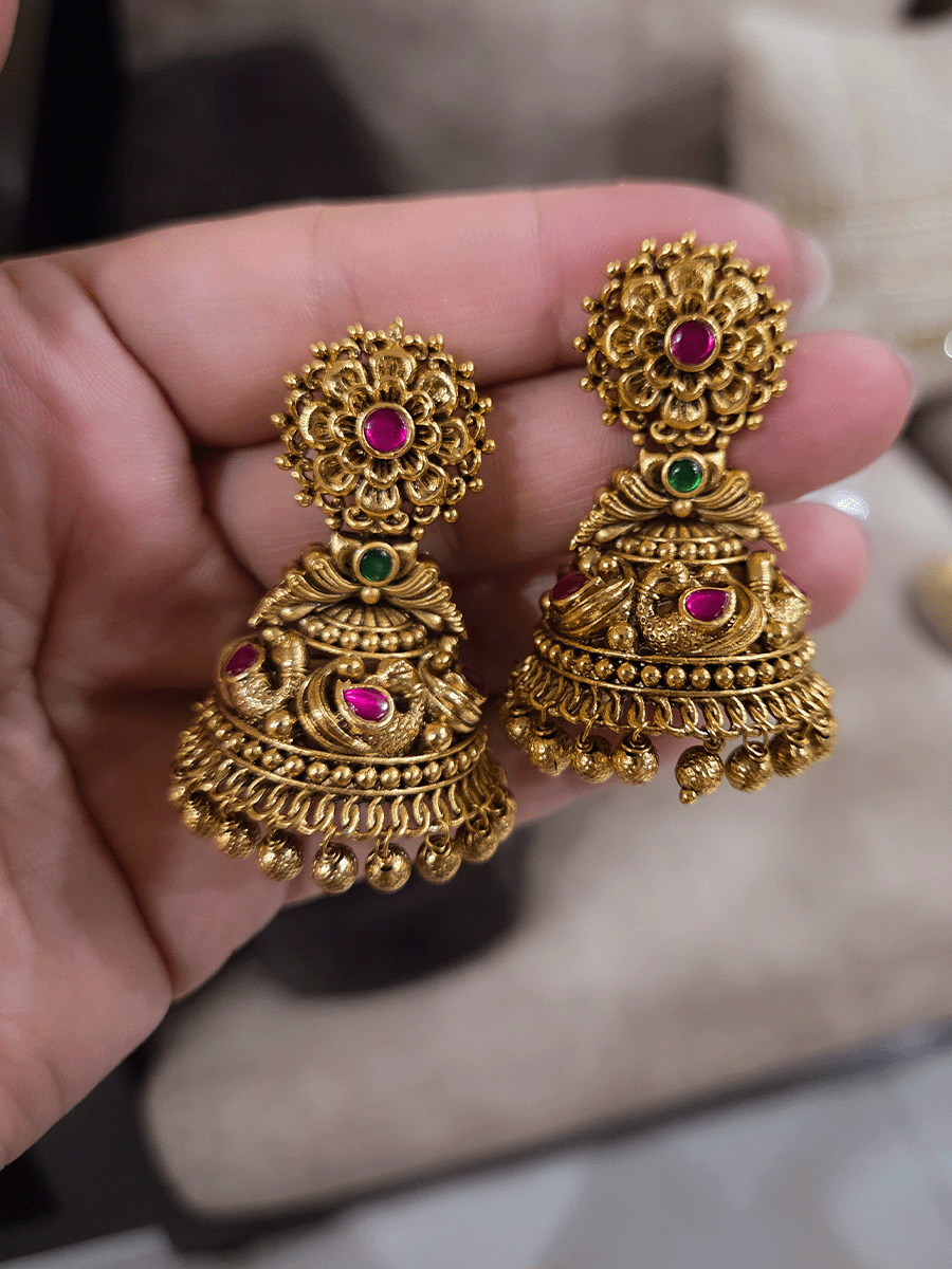 Elevate your ethnic ensemble with these exquisite ruby stone domb jhumkis, featuring an intricate peacock design adorned with lustrous ruby stones. The delicate flower-top detailing adds timeless elegance, while the traditional dome shape creates a graceful drape. Perfect for weddings, festivals, and special occasions, these statement earrings blend classic craftsmanship with radiant gemstone beauty. Ideal for those who appreciate authentic Indian jewelry that celebrates heritage and sophistication.