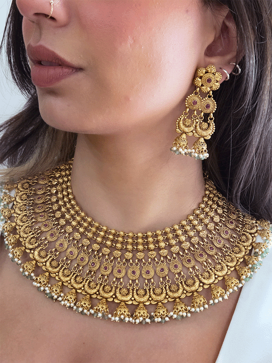 Broad choker set with circular tukdies and half jhoomki aqua bead design