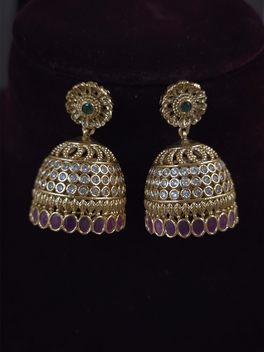 This exquisite choker showcases a stunning 5cm broad flower centerpiece adorned with traditional polki diamonds, creating an opulent focal point. The design features a graceful line of oval ruby stones that adds rich crimson elegance, while delicate zircon loop hangings cascade below, catching light with every movement. Crafted with meticulous attention to detail, this piece combines classic Indian jewelry artistry with sophisticated gemstone work. Perfect for weddings, celebrations, or special occasions, it elevates any ensemble with timeless grandeur and refined luxury.