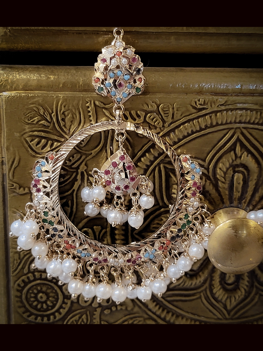 Elevate your look with our 9.5cm long jadau Chandbali. This premium piece features a stunning leaf shaped hanging tukdi in the center, adding a touch of luxury to any outfit. Crafted with intricate details, this 57gm beauty exudes sophistication and elegance. Make a statement with our exclusive design.