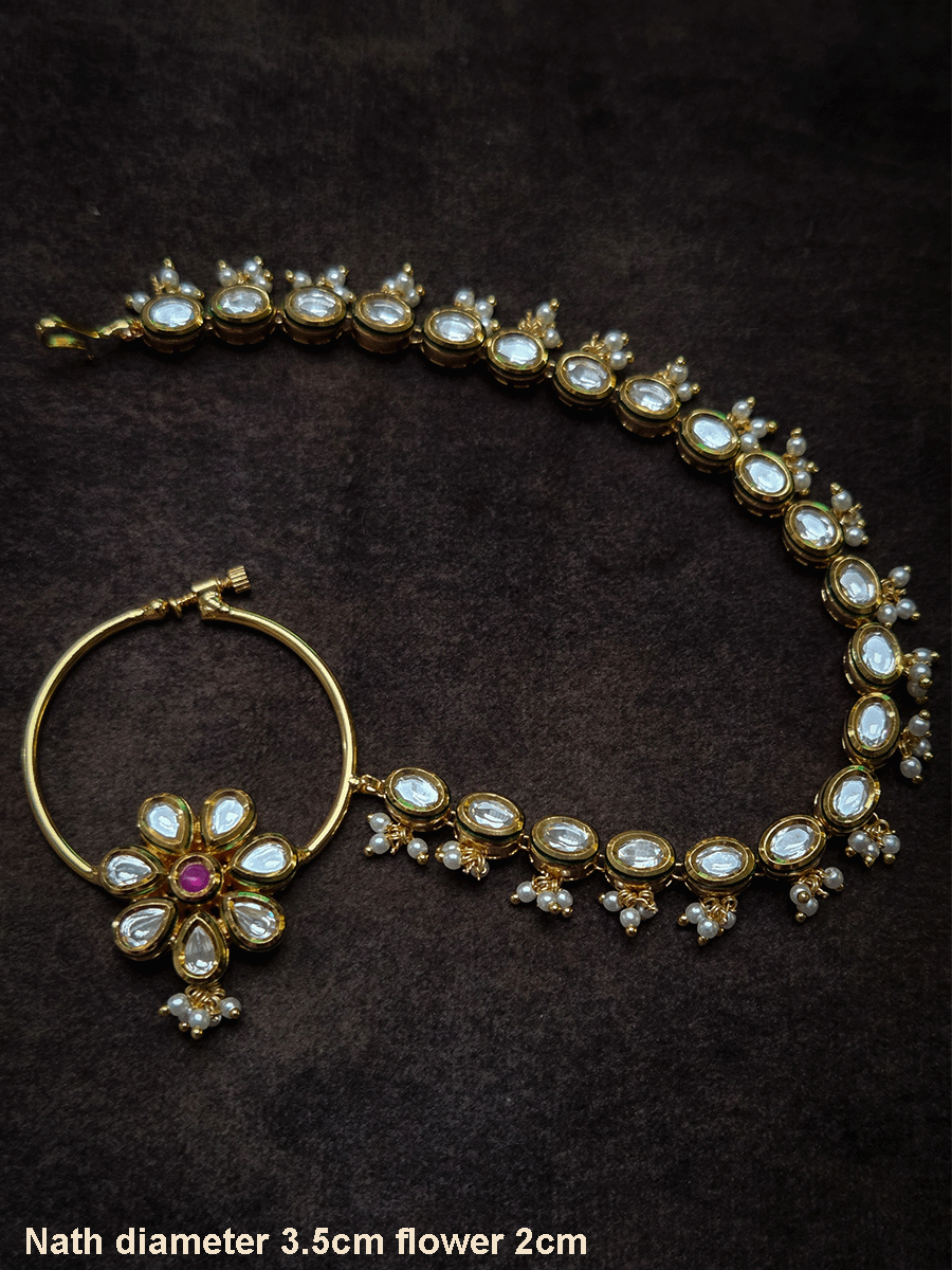 Kundan flower with coloured stone 3.5cm diameter nath with oval kundan chain with pearly hangings